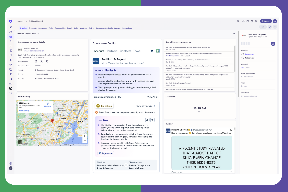 The Crossbeam Copilot tab shows up in Account, Contact, and Opportunity views within Outreach.