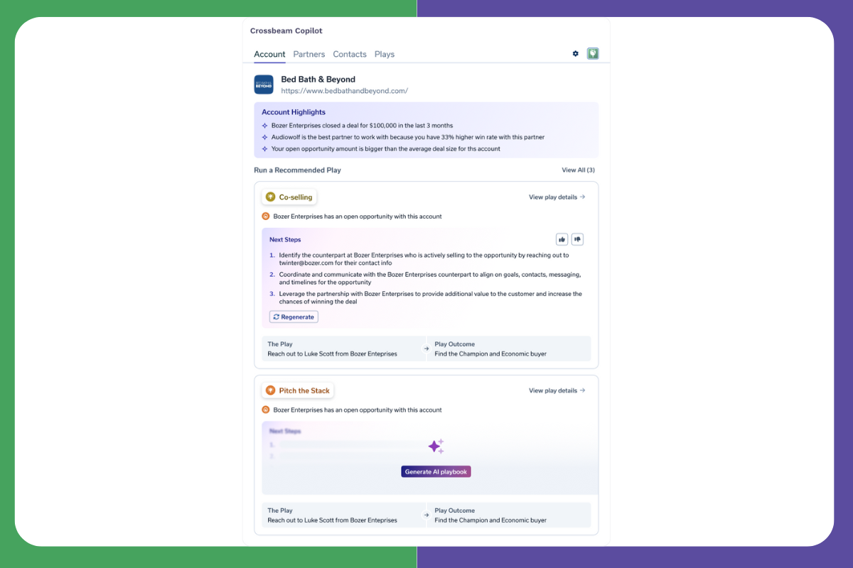 With Crossbeam Copilot for Outreach, reps gain partner overlap data, AI-recommended co-sell plays, and partner contacts surfaced inside Outreach.